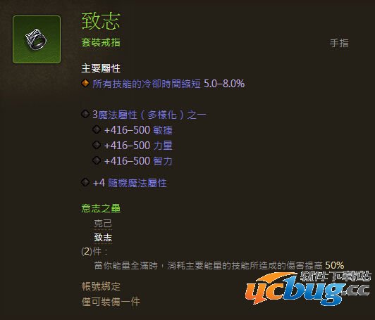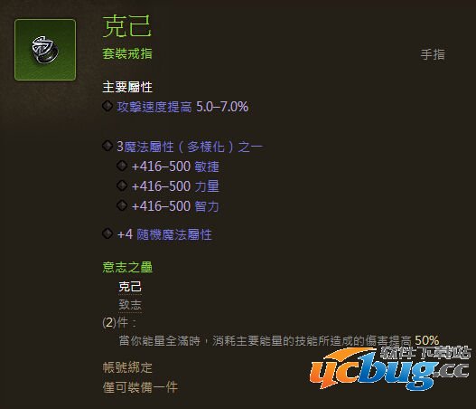 与这对套戒相反的例子我们则可以说说无尽行旅套装。虽然它们有一点点区别,那就是无尽行旅套装是戒指与护身符的组合。这对套装的属性相对简单,护身符中规中矩,戒指是特别的五属性,特效则是体能与50%暴击伤害。无尽行旅套装的整体能力可以给玩家带来很不错的火力提升,尤其是对猎魔人玩家而言。多一条攻速词缀,又不会损失暴击和爆伤。只会占用一个戒指位。