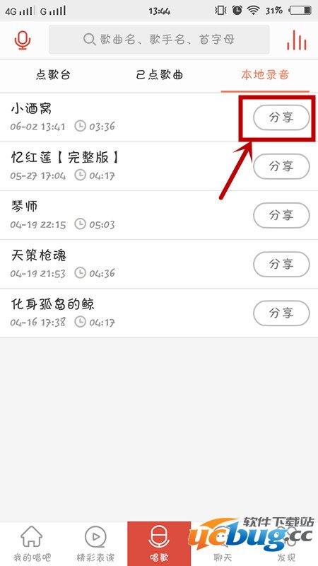 录音保存完毕后 在本地录音界面 选择刚刚录制的《小酒窝》作品后面的分享选项