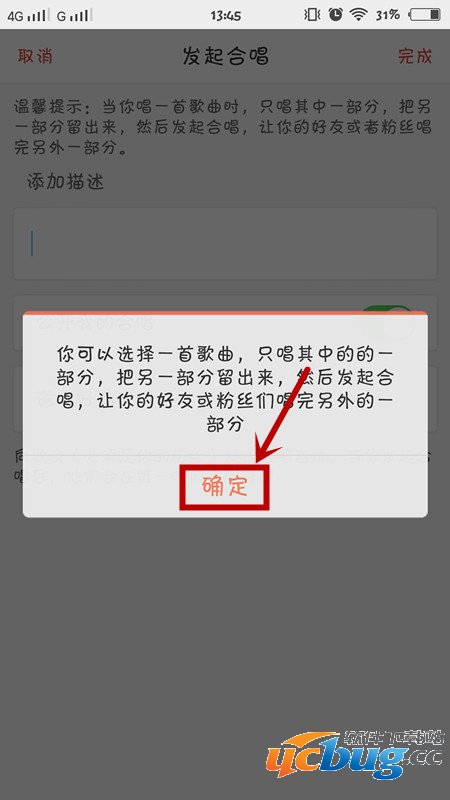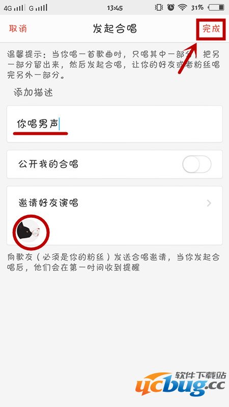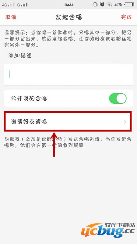 在该界面可以选择邀请好友演唱 还可以添加描述