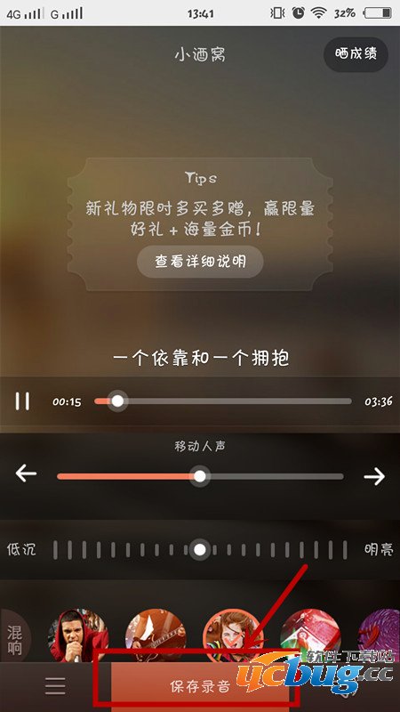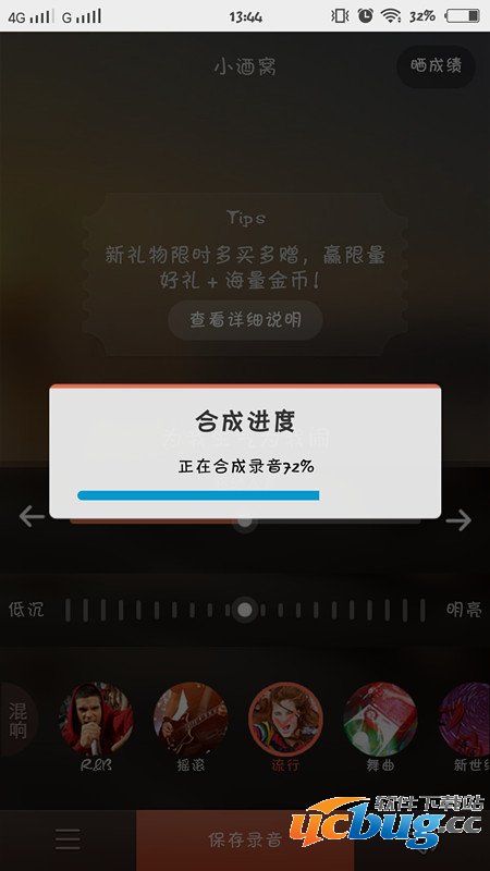 演唱完毕后 可以调试自己的歌声 觉得可以了 就点击保存 等待歌曲合成完毕