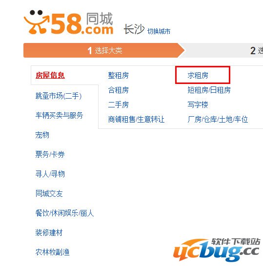 2、进入发布信息的页面将鼠标放在“房屋信息”上,然后点击“求租房”