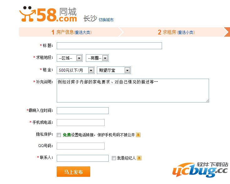 3、然后填好你的求租信息,留下你的手机号码,和正确信息就可以了,最后点击“马上发布”