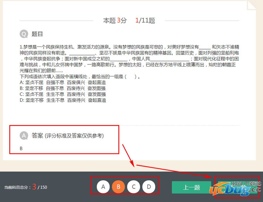 4、然后你按照你的记忆选择你当时高考时的选项,正确答案上面也有,大家可以看看,选好之后大家选择点击“下一题”