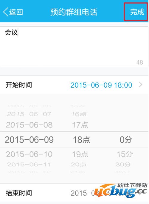 接下来,在弹出的页面中我们需要填写群组电话的预约信息,可以先填写相关主题,然后选择群组电话开始和结束时间。在选择开始时间和结束时间的时候,只需要点击待选时间选项就可以进行切换而不是滑动模式。