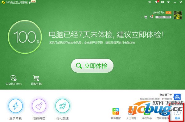 第一步、打开360安全卫士,点击右下角“功能大全”旁边的“更多”,电脑上没有360安全卫士的朋友请下载安装。(若是台式机请自备无线网卡器)
