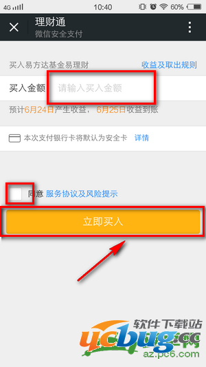 七、在买入界面填写你想要买入的金额,注意要勾上同意“服务协议及风险提示”选择立即买入