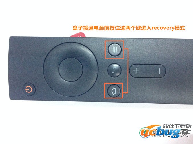 盒子先连接 电视数据线(HDMI) ,在接通电源之前 同时按住 遥控的 home键 以及 菜单键 ,如下图: