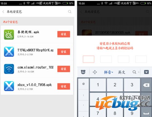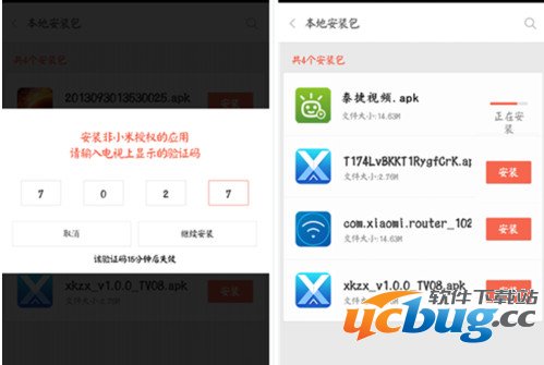 从“装应用”中选择“安装包”,就可以从本地安装包中找到要安装的第三方软件点击安装,会弹出窗口提示“请输入电视上显示的验证码”,电视屏幕上会出现相对应的4位验证码,手机上输入即可。