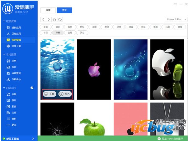 2、例如我们选择“苹果”分类,找到喜欢的壁纸,鼠标放在想要的壁纸上面,就可以直接“下载”或者“导入”;