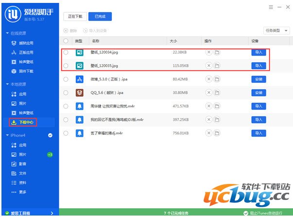3、回到爱思助手左侧的“本地资源”-“下载中心”,可以看到正在下载或者已经下载完成的壁纸,选择想到的壁纸,点击“导入”即可以导入设备了;