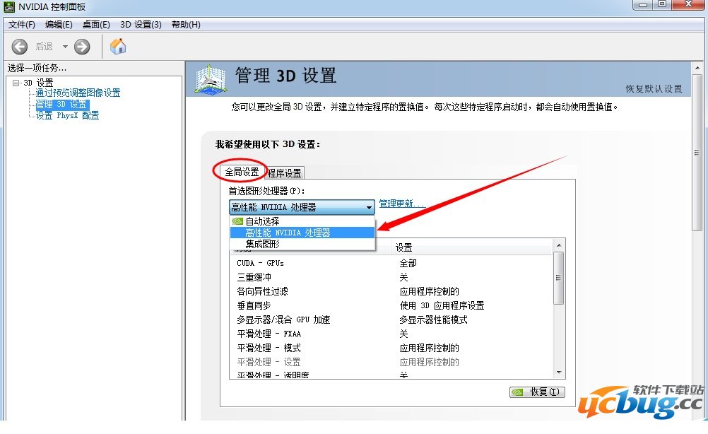 管理3D设置 > 全局设置 > 高性能NVIDIA处理器 > 点击“应用”按钮保存