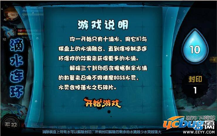 这个游戏类似于消除游戏,过了三个封印以后剩余的水滴越多BOSS越弱!!!