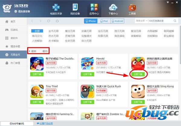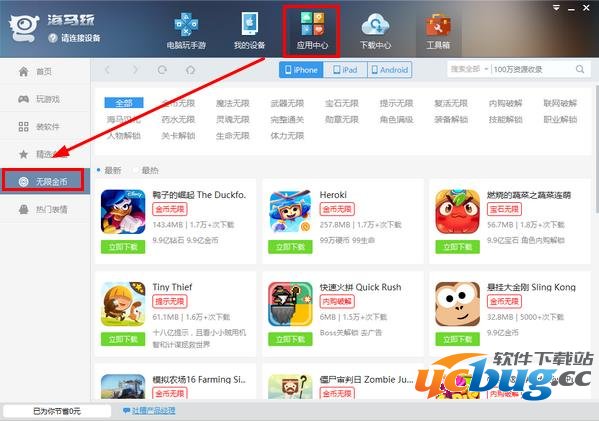 方法其很简单,下载海马苹果助手并安装,然后将手机连接到电脑上。打开海马玩,然后点应用中心,在左侧列表找到无限金币。