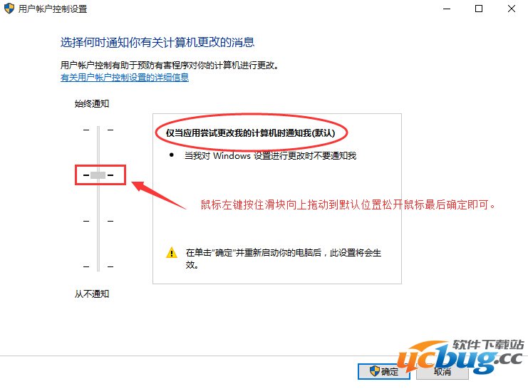 在打开的用户帐户控制设置窗口,我们用鼠标左键按住滑块向上拖动;把滑块拖动到默认位置,松开鼠标,再点击:确定;