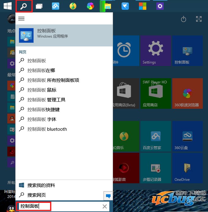 第一步:点击Windows10系统【搜索图标】并在搜索框内输入“控制面板”并按回车。↓
