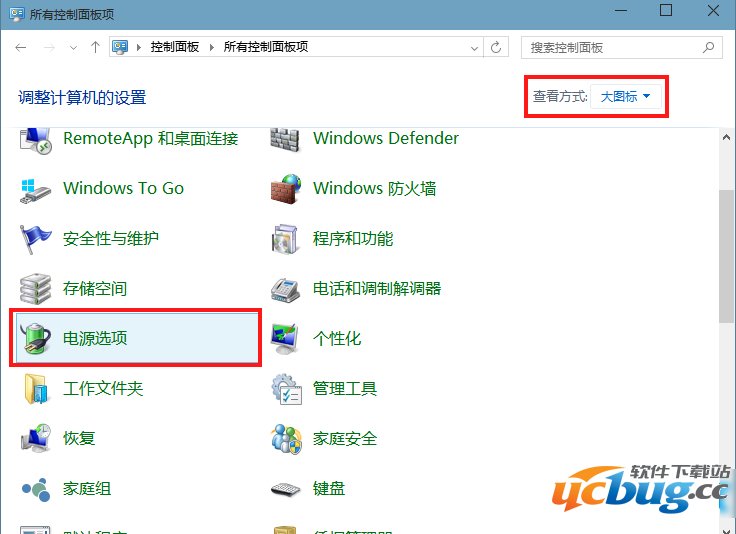 第二步:在右上方【查看方式】选择大图标或小图标,并找到【电源选项】,单击【电源选项】。↓