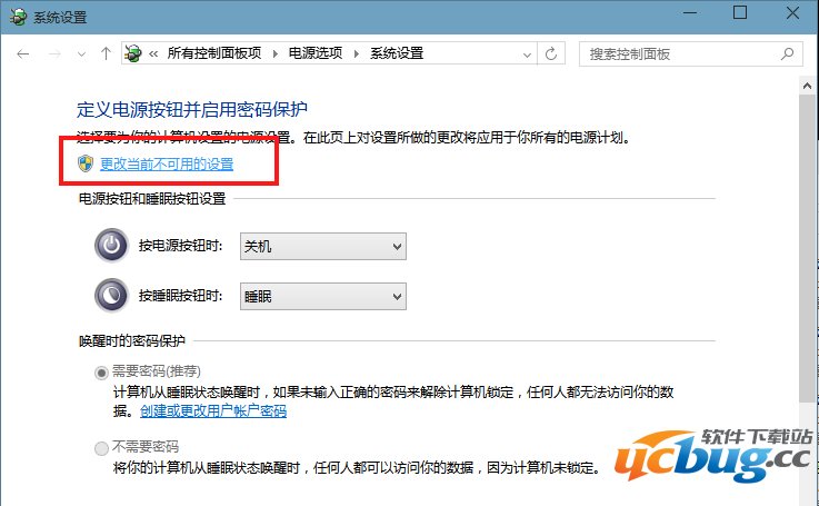 第四步:找到【更改当前不可用的设置】单击,单击后向下找到【休眠】并勾选,最后保存修改。↓