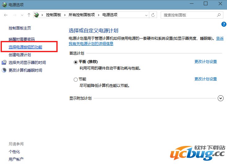 第三步:找到左侧链接选项中的【选择电源按钮的功能】,并单击。↓