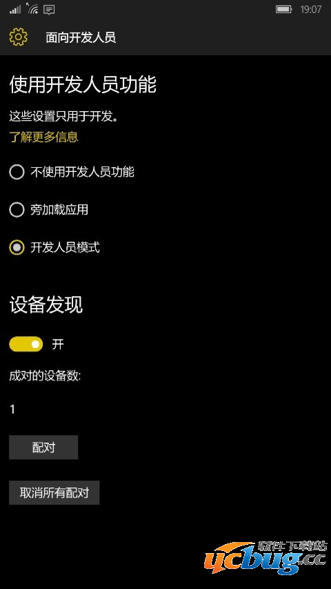 3. 打开wp10手机, 设置--更新和安全--面向开发人员 : 勾选开发人员模式 ,打开设备发现