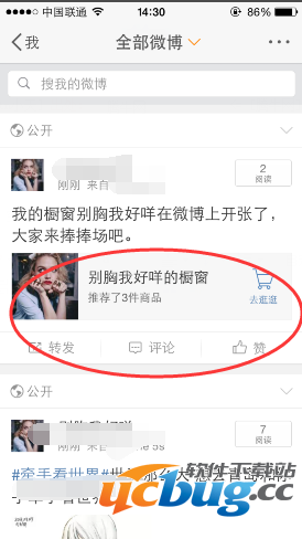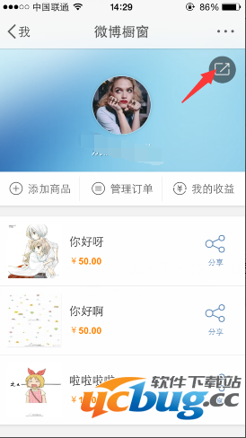 如果大家要分享商品,可以点击每个商品的分享链接,如果分享你的橱窗小店,那就点击头像右上方分享,然后发送微博即可。