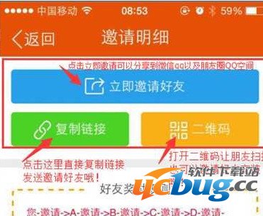 进入邀请好友界面,可以直接复制邀请链接发给好友,或者点击“立即邀请好友”分享给好友或者朋友圈,也可以邀请好友扫一扫二维码