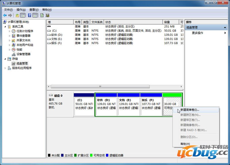 首先,右键计算机图标----管理----磁盘管理,在一个分区较大的磁盘右键添加一个压缩卷。