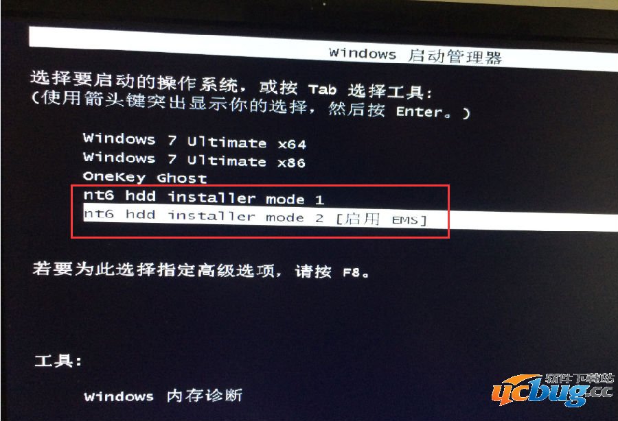 重启后用箭头上下键选择红框内的任意一项:nt6的加载项。回车即可。