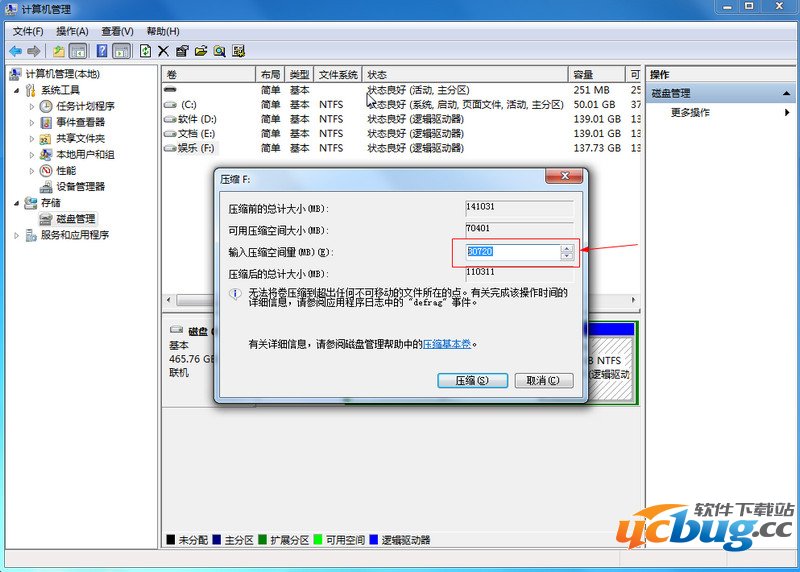 然后填写你想要分给新加卷的容量,这里是按MB计算的,1024MB=1G 建议分30G以上的空间,30G就是30*1024=30720,再点击压缩。