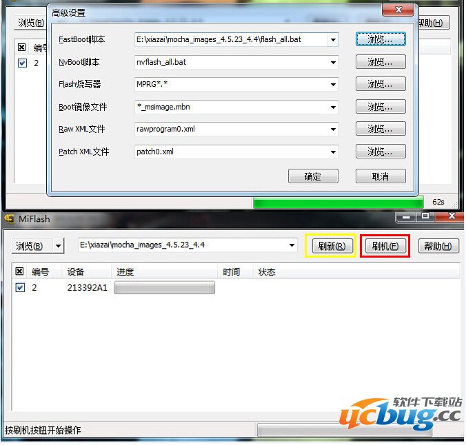 点击黄色圈选部分刷新,刷机程序会自动识别手机,点击浏览旁的向下箭头,选择高级设置--选择fastboot刷机脚本为ROM路径中flash_all.bat,点击红色圈选部分刷机开始刷机。