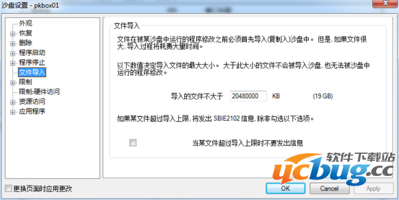 a) 在沙盘pkbox01上鼠标右键,选择“沙盘设置”,在“导入的文件不大于”处填写20480000。可以填大一些,不过此处似乎沙盘存在一些bug。