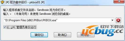 5. 接下来就可以开始使用沙盘多开pkbox了。在沙盘pkbox01上鼠标右键,选择“在沙盘中运行”à“运行任意程序”,弹出对话框,选择pkbox的安装路径下的PKBOX.exe,并勾上“以UAC管理员身份运行”: