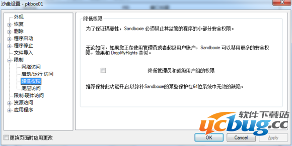 b) 点击Apply按钮保存,然后打开“限制”,选择“降低权限”,将“降低管理员和超级用户组的权限”前面的勾去掉: