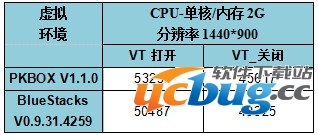 但是VT关闭的情况下,Bluestacks得分高出PKbox,