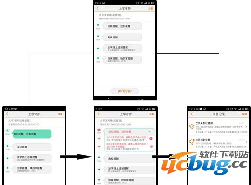 当设定好了学校、住址后,就可以开启上学防护了。当到达预设的时间,手机APP会不断闪出绿色弹框,提醒家长此时孩子应该要做什么;若到了设定时间点,孩子还没到达指定地点,系统会不断有红色字样出现,提醒家长注意;此外,电话手表还会不断给APP发送提醒消息,打开APP的消息记录页面就可以全部看到。