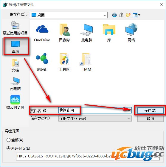 2、在打开的导出注册表文件窗口,检查注册表路径是否正确(最下面的所选分支),再点击:桌面,在文件名(N)栏输入:快速访问,点击:保存;