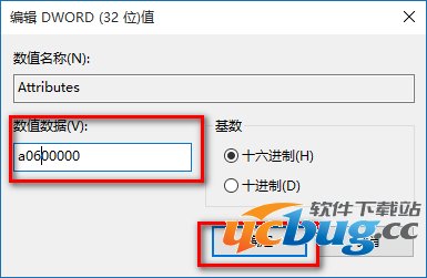 9、我们现在可以修改Attributes的键值了,左键双击:Attributes,在弹出的编辑DWORD(32位)值对话框中,把Attributes的数值数据从a0100000修改为a0600000,再点击:确定,退出注册表编辑器。