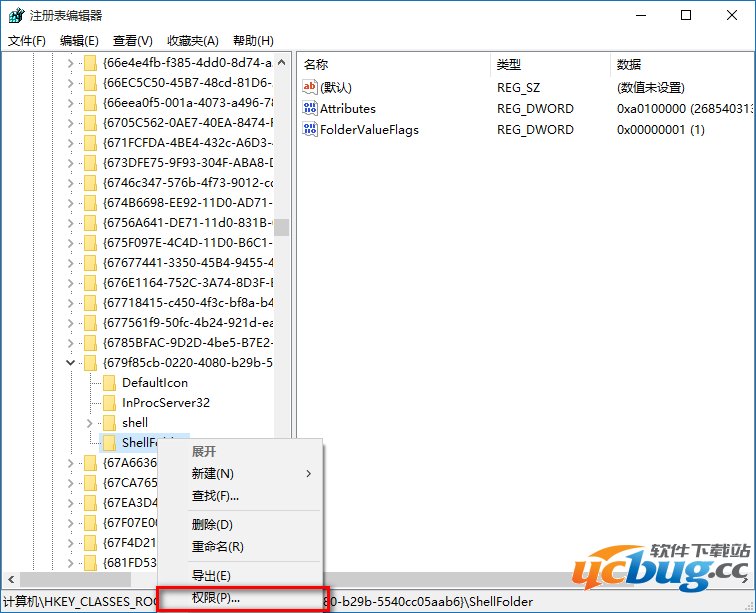 4、我们备份了{679f85cb-0220-4080-b29b-5540cc05aab6}ShellFolder的注册表键值,现在再来修改ShellFolder的权限值(不修改ShellFolder的权限值,则无法修改Attributes的键值),右键点击ShellFolder,在右键菜单中点击:权限;