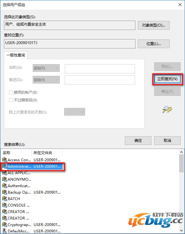 7、我们点击高级以后,选择用户或组的对话框有所变化,在这个对话框中点击:立即查找(N);在搜索结果(U)的列表中找到本机用户名并左键点击,再点击:确定;