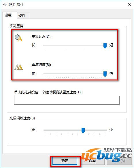 在打开的键盘属性窗口,在字符重复栏,把重复延迟(D)的滑块拉到最短位置,把重复速度(R)的滑块拉到最快位置(如图),然后点击:确定。