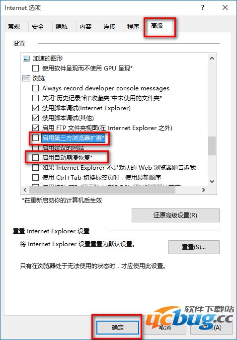 切换到“高级”选项卡,在“设置”窗格中向下滚动设置项,找到“浏览”区域的“启用第三方浏览器扩展”以及“启用自动崩溃恢复”选项,取消勾选,确定关闭窗口,重启电脑。