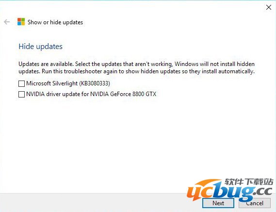 勾选不想安装的更新后,点击下一步即可实现Win10更新或驱动隐藏