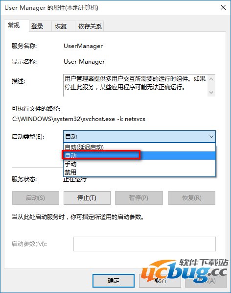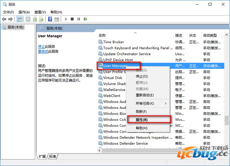 3、找到User Manager服务,右键点击选择“属性”(如上图)。