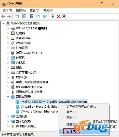 2、找到网络适配器,在有问题的以太网卡或者无线网卡上点击右键,选择“属性”(或直接双击该网卡),如下图——