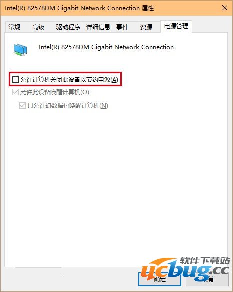 3、点击“电源管理”选项卡,取消勾选“允许计算机关闭此设备以节约电源”后点击确定,如下图——