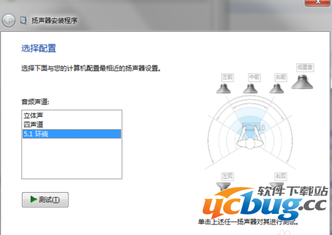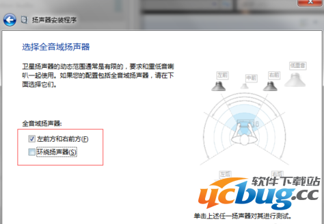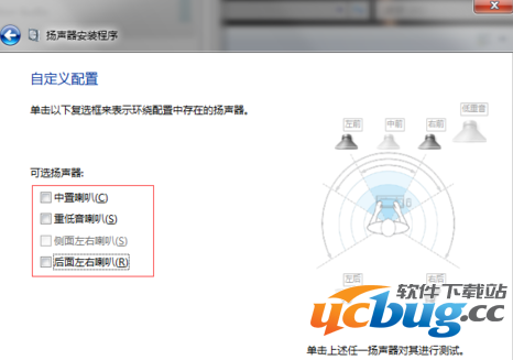 在新界面左侧,取消勾选“环绕扬声器”(同样因为 2.1声道并无此设备),进入下一步;