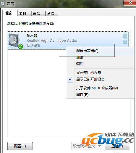 此时就弹出一个“声音”窗口,在选择设备框里面找到并右击【扬声器】,选择并打开第一项【配置扬声器】菜单;