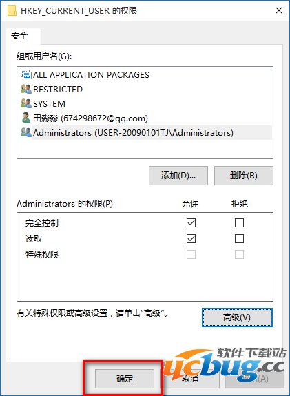 回到HKEY_CURRENT_USER的权限窗口,点击:确定,退出注册表编辑器。
