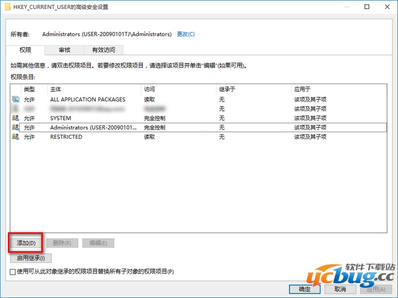 在打开的HKEY_CURRENT_USER的高级安全设置窗口,点击:添加;