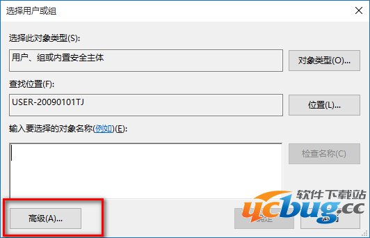 在打开的选择用户和组对话框中,点击:高级;