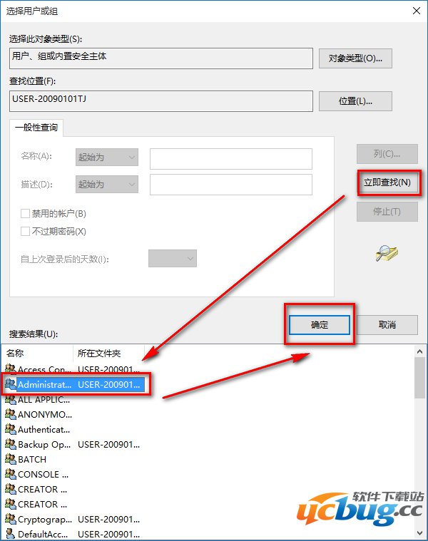 按下来,我们在对话框中点击:立即查找(N);在搜索结果(U)栏中用鼠标按住右侧的小滑块向下拖动,找到本机登录的用户名如:GONG ZOU,并左键单击用户名,再点击:确定;